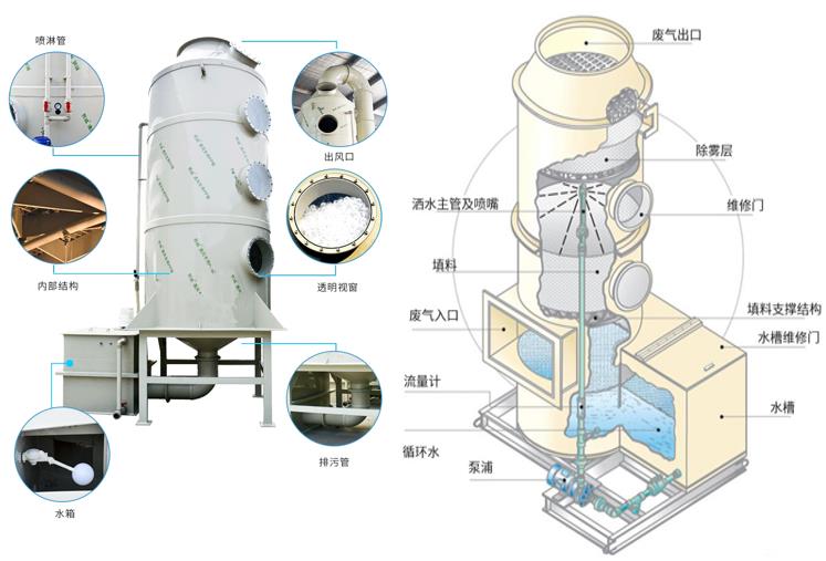 原理簡述:酸堿或含塵廢氣通過風管引入凈化塔,噴淋循環液在塔底用水泵加壓后,通過防堵塞螺旋噴頭將吸收劑形成霧氣分子,然后通過填料層后再循環到塔底。酸堿廢氣和吸收液充分接觸,發生酸堿中和反應,去除廢氣中的酸堿成分等,同時液滴還會對粉塵進行攔截,有效去除廢氣中的顆粒物。凈化的廢氣經除霧器除去多余的水汽,然后進入下個處理單元進行深度處理,終由風機排放到大氣中。